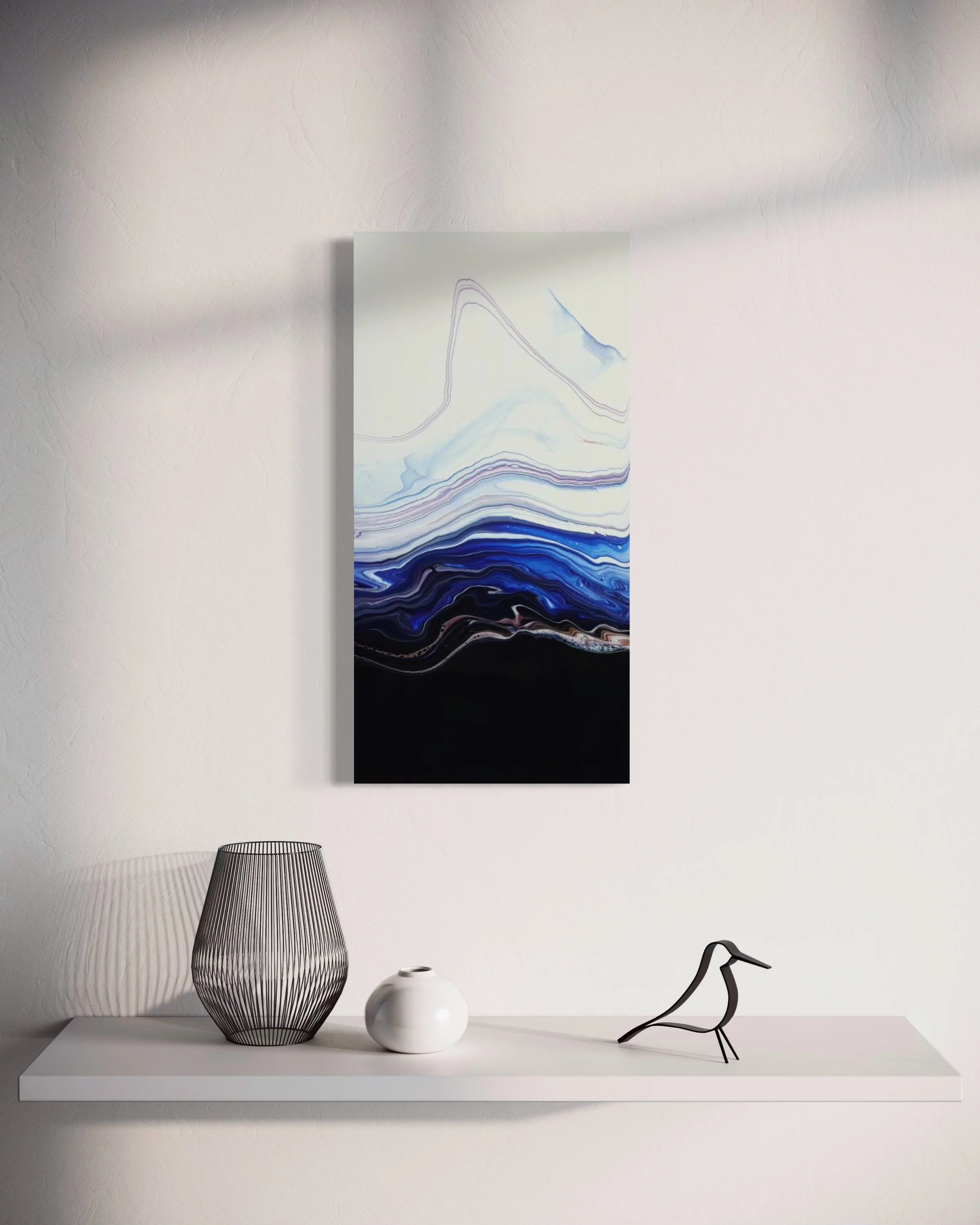 Ocean Dream is a meditation in motion—layered currents of indigo, lavender, and navy-black rise gently into a luminous wash of pale light. The fluid lines pulse between stillness and momentum, evoking the depth of the sea and the silence of a dream.